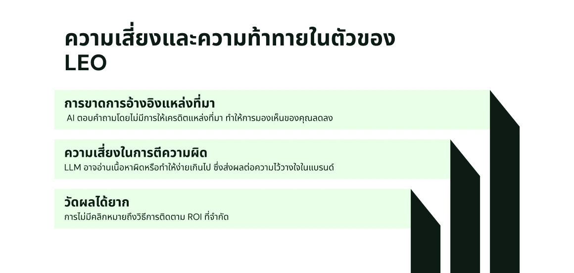 • ความเสี่ยงของการตีความผิด – LLMs อาจเข้าใจผิดหรือสรุปเนื้อหาของคุณง่ายเกินไป ซึ่งอาจเป็นอันตรายต่อความไว้วางใจในแบรนด์